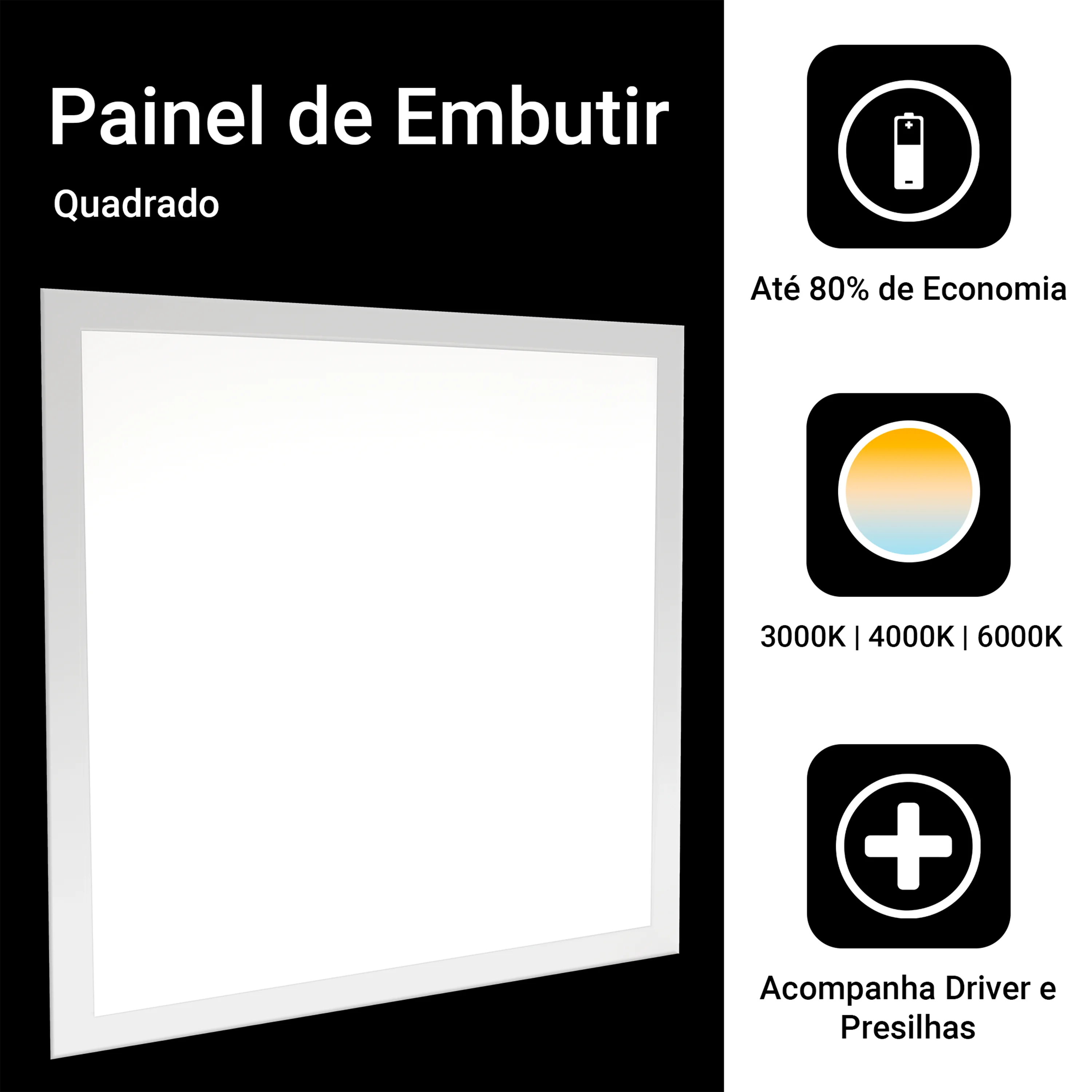 O Painel de LED Embutir permite uma iluminação bem distribuída tornando o ambiente elegante, agradável e moderno. Podem ser instalados em superfícies variadas, como por exemplo: forros de gesso, modulares, forros de madeira, PVC ou similares, proporcionando uma iluminação abrangente e difusa. Esta luminária precisa ser embutida no local desejado, isto é, ela demanda um recorte na área na qual será instalada.
