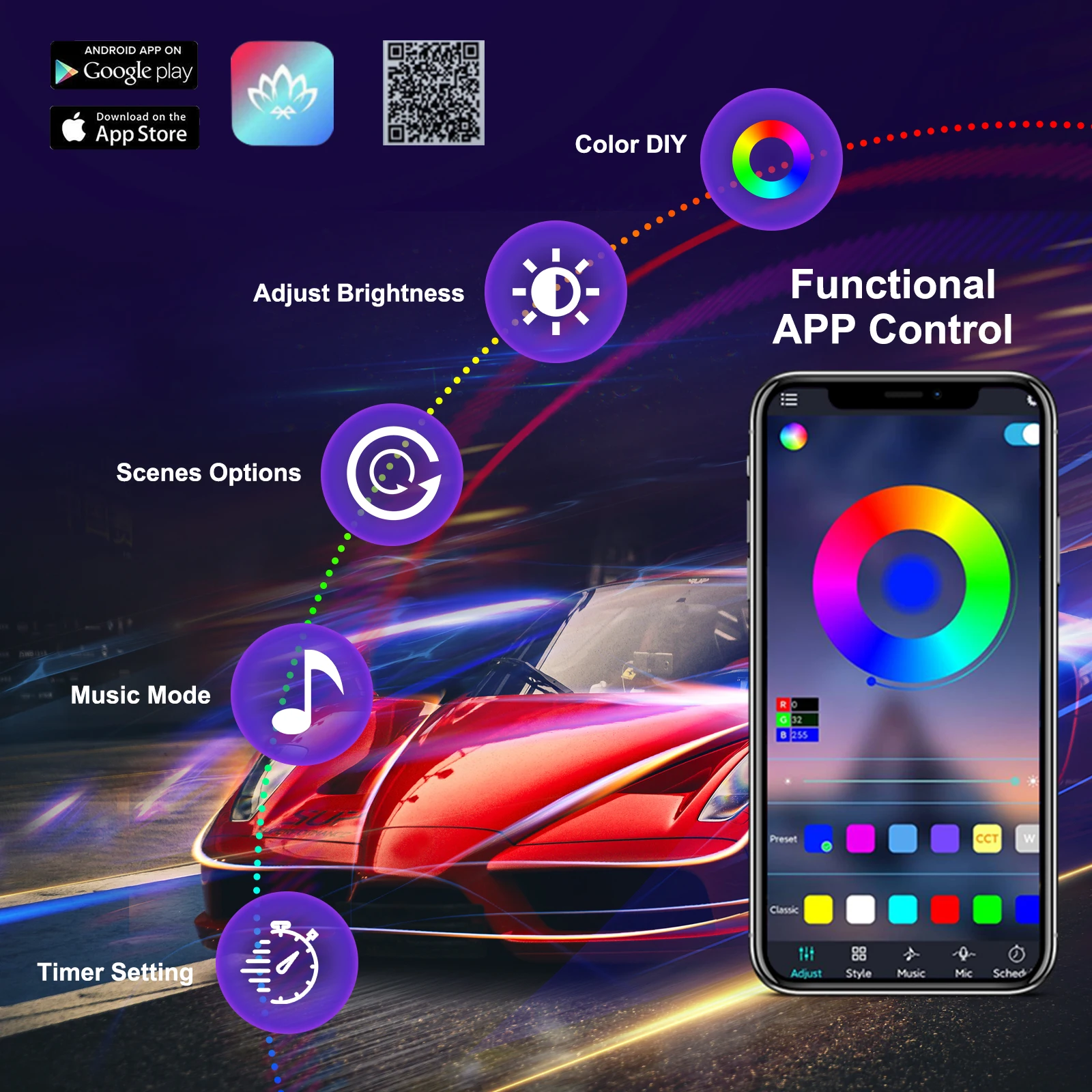 1. Download the application by the QR code on the main control box first, control light mode via Bluetooth connection. This product include 1 main control box ,4 sub control box. Main controller power connect to ACC Fuse, Sub controller power connects to 12V Constant Power