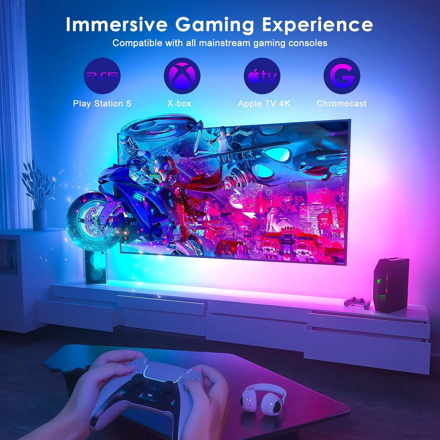 Perfeito para gamers, streamers ou noites de cinema – conecte, acenda e mergulhe!