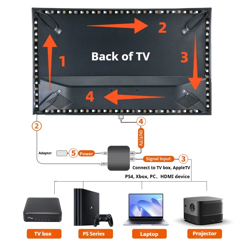Como funciona: A luz de fundo é sincronizada analisando o sinal de vídeo da sua fonte de mídia externa.Certifique-se de que ele esteja conectado entre o seu dispositivo de mídia e a TV.